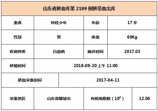 2018年9月21日上午11:00,15歲查(cha)姓少(shao)年因患急性髓細(xi)胞(bao)白血病,在安徽某三甲醫(yi)院接受臍帶血(xue)移植,參與本次移植的臍帶血(xue)與患者6/10位點相合,有(you)核(he)細(xi)胞數為16.07*10^8。整個(ge)輸注過程很順(shun)利,無不良(liang)反(fan)應,愿患(huan)者早日恢復健康。