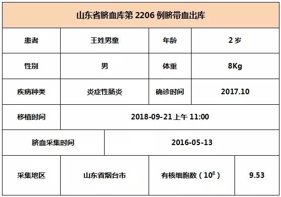 2018年9月21日上午11:00,2歲(sui)王姓男(nan)童因患炎癥性(xing)腸(chang)炎,在(zai)上(shang)海(hai)某三甲醫院接受臍帶血移(yi)植,參與本次移(yi)植的臍帶血與患者9/10位點相合,有核細胞數(shu)為9.53*10^8。整(zheng)個(ge)輸注過程很順利,無不良反應,愿患(huan)者(zhe)早(zao)日恢復健康。