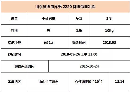 2018年9月26日上午11:00,2歲(sui)王(wang)姓男童因(yin)患石骨癥(zheng),在上(shang)海某三甲醫院接受(shou)臍帶(dai)血移(yi)(yi)植,參與本次(ci)移(yi)(yi)植的臍帶(dai)血與患者6/10位(wei)點(dian)相合,有(you)核細胞(bao)數為13.14*10^8。整個(ge)輸注過(guo)程很(hen)順利,無不(bu)良反應,愿患者早(zao)日恢復健(jian)康。