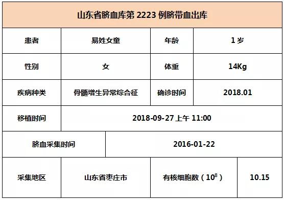 2018年(nian)9月27日上午11:00,1歲易姓女童(tong)因(yin)患骨髓增生(sheng)異常綜合征,在(zai)上海某三甲醫院接(jie)受臍帶(dai)血(xue)移(yi)植(zhi)(zhi),參與本(ben)次移(yi)植(zhi)(zhi)的臍帶(dai)血(xue)與患者7/10位點相合(he),有核細胞(bao)數為10.15*10^8。整個輸(shu)注過程很(hen)順利(li),無不(bu)良反(fan)應,愿(yuan)患者早日(ri)恢復健康。