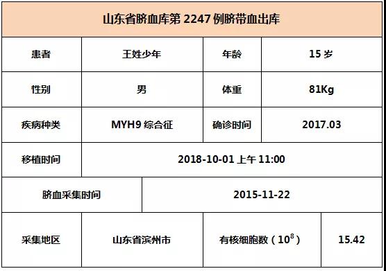 2018年10月(yue)01日上午11:00,15歲王姓少年因(yin)患MYH9綜(zong)合征,在遼寧某(mou)三甲醫院(yuan)接受臍(qi)帶血移(yi)植(zhi)(zhi),參與(yu)本(ben)次移(yi)植(zhi)(zhi)的臍(qi)帶血與(yu)患者6/10位點相合,有核細胞數為15.42*10^8。整個輸注過程很順利,無不(bu)良(liang)反應,愿患者早日恢復健(jian)康。