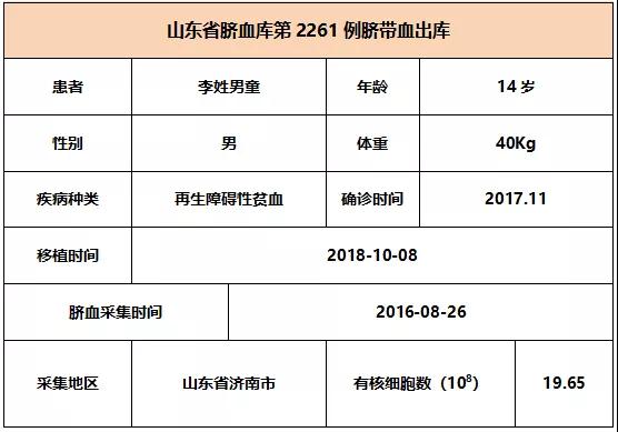 2018年10月08日,14歲李姓男童因患再(zai)生障礙性(xing)貧血,在(zai)山東某三甲醫院(yuan)接受臍帶血移植,參與本次移(yi)植的臍(qi)帶血與患者9/10位點相合,有(you)核細(xi)胞數(shu)為19.65*10^8。整個輸注過程很順利,無不良反應,愿患者早日恢復健康。