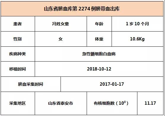 2018年10月11日(ri),8歲(sui)劉姓(xing)女(nv)童因患骨髓增生異常綜合征,在(zai)河(he)北某三甲醫院接受臍帶血移(yi)植,參(can)與(yu)本次移植的(de)臍帶血與(yu)患(huan)者4/6位點相合,有核細(xi)胞數為14.16*10^8。整個輸注過程很順(shun)利(li),無不良(liang)反應,愿患者(zhe)早日恢復健康。