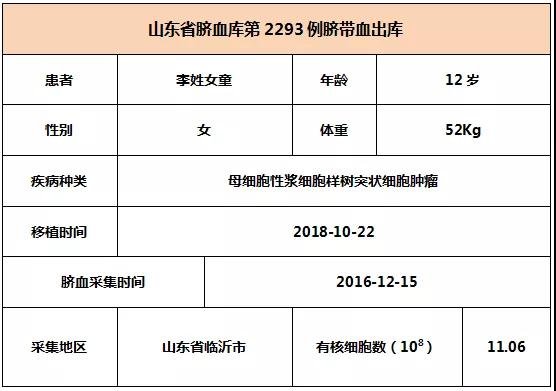 2018年10月22日(ri),12歲李姓女(nv)童因(yin)患母(mu)細胞性漿細胞樣(yang)樹突(tu)狀細胞腫瘤,在河北某(mou)三甲(jia)醫院(yuan)接受臍(qi)帶(dai)血移植(zhi),本(ben)次移植(zhi)的臍(qi)帶(dai)血與(yu)患(huan)者7/10位點相合(he),有核細(xi)胞數(shu)為11.06*10^8。整個輸注(zhu)過程很順(shun)利,無(wu)不良反(fan)應,愿患者早日恢復健康。