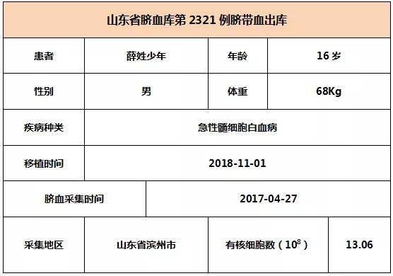 2018年11月01日,16歲薛姓少年因患急性髓細胞白(bai)血病,在天津(jin)某三甲醫院接(jie)受(shou)臍(qi)帶(dai)血移(yi)植(zhi),本(ben)次移(yi)植(zhi)的臍(qi)帶(dai)血與患者6/10位點相合(he),有(you)核細胞(bao)數為13.06*10^8。整個輸(shu)注過程(cheng)很順利,無不(bu)良反應,愿患者早日恢復健康。