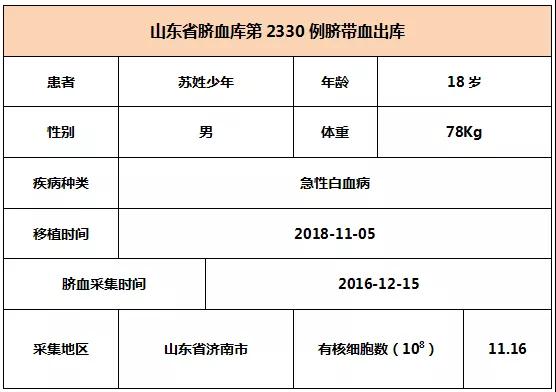 2018年11月05日,18歲蘇(su)姓(xing)少年因患急性(xing)白(bai)血病,在北(bei)京某三(san)甲醫院接受臍帶血移植(zhi),本次移植(zhi)的臍帶血與患(huan)者7/10位點(dian)相合,有(you)核(he)細胞(bao)數(shu)為11.16*10^8。整個輸注過程(cheng)很順利(li),無不良反(fan)應(ying),愿患者早日恢復健康(kang)。