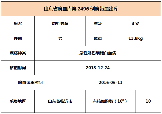 2018年12月24日,3歲周姓男(nan)童因患(huan)急(ji)性淋巴細胞白血病(bing),在江蘇(su)某三甲醫院接受臍帶(dai)血移植(zhi),本次移植(zhi)的(de)臍帶血與患(huan)者(zhe)9/10位點相合,有核(he)細(xi)胞數為10*10^8。整個輸注過程很順利,無不良反應,愿(yuan)患者早日恢復健康。