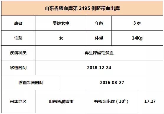 2018年12月24日(ri),3歲(sui)吳姓女童因患(huan)再(zai)生(sheng)障礙性貧血,在上海(hai)某三甲醫院(yuan)接受臍帶(dai)血移(yi)植,本次移植(zhi)的臍帶(dai)血與患者4/6位點相合,有核細(xi)胞數為(wei)17.27*10^8。整個(ge)輸(shu)注過程很順利,無不良反應,愿患者早(zao)日恢復(fu)健康(kang)。