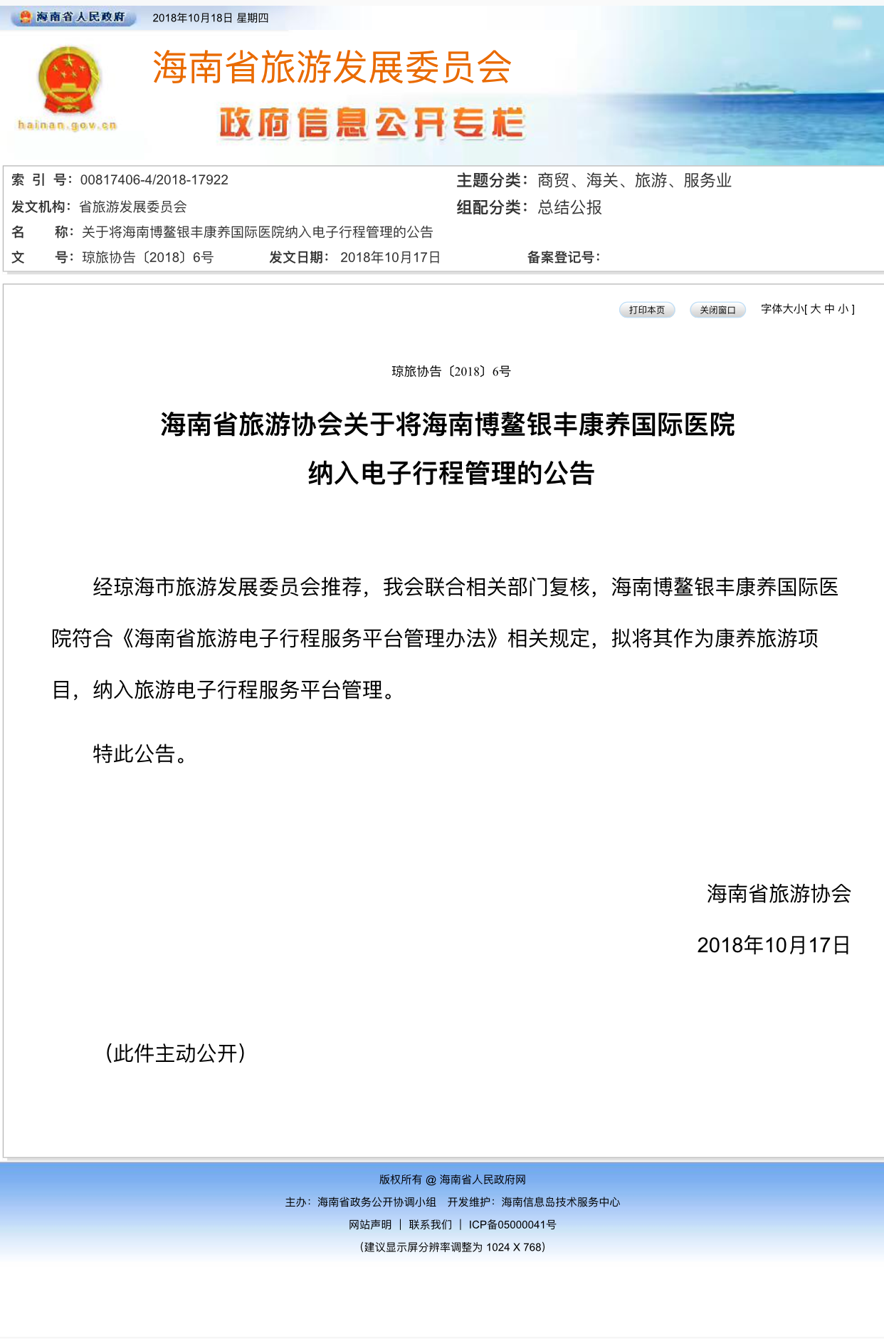 10月(yue)17日,海(hai)(hai)(hai)南(nan)(nan)(nan)省人民政府網站發布(bu)《瓊旅(lv)(lv)協(xie)告〔2018〕6號》公告,公告顯(xian)示海(hai)(hai)(hai)南(nan)(nan)(nan)省旅(lv)(lv)游(you)協(xie)會(hui)將海(hai)(hai)(hai)南(nan)(nan)(nan)博鰲·銀豐康(kang)養(yang)國際醫(yi)院作為海(hai)(hai)(hai)南(nan)(nan)(nan)省康(kang)養(yang)旅(lv)(lv)游(you)項目,納(na)入旅(lv)(lv)游(you)電子行程服務管理平臺。
