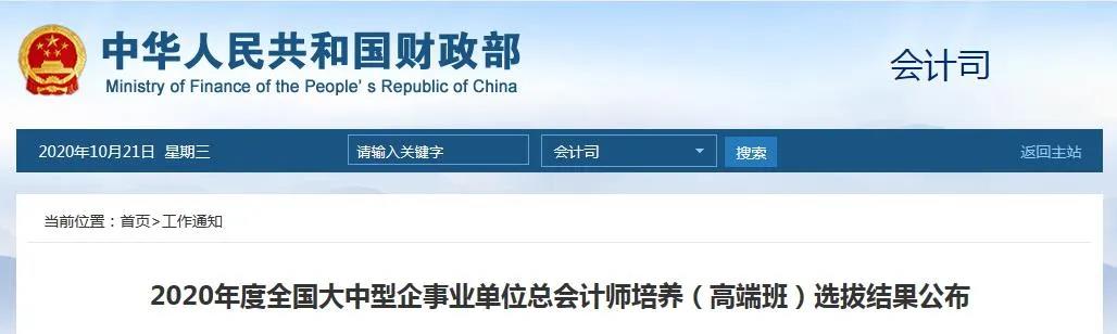 選拔工作(zuo)經過筆(bi)試、資料審(shen)核(he)、面(mian)試等環節,于日前(qian)結(jie)束(shu)。2020年10月19日(ri),財政(zheng)部官網公(gong)布2020年度全國(guo)大中型企事業單(dan)位(wei)總會計(ji)師培養(高(gao)端班)入選人員名(ming)單(dan)。北京、上海、廈門國(guo)家會計(ji)學(xue)院(yuan)將根據負責培養的(de)學(xue)員名(ming)單(dan),分別寄送(song)錄取通知(zhi)。